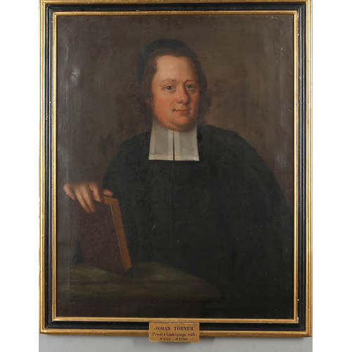 Porträtt av Törner iklädd prästrock med Prästkrage_(plagg)#Elva|elva om halsen. Porträtt av okänd.